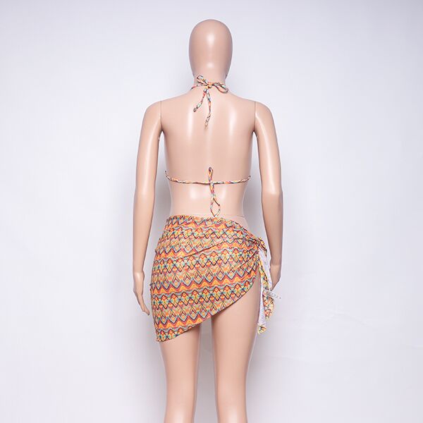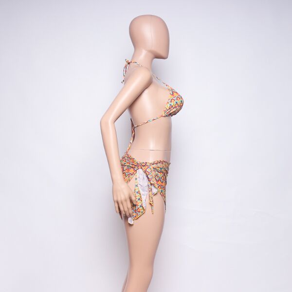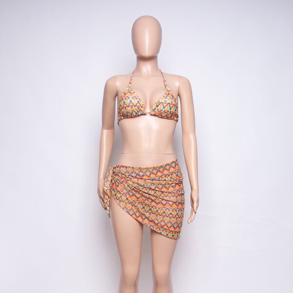 Introducing a stylish and versatile three-piece swimsuit set for women, complete with a sarong for added elegance. This set features a chic chevron pattern printed on both the bikini and the sarong, adding a touch of sophistication to your beach or poolside look.