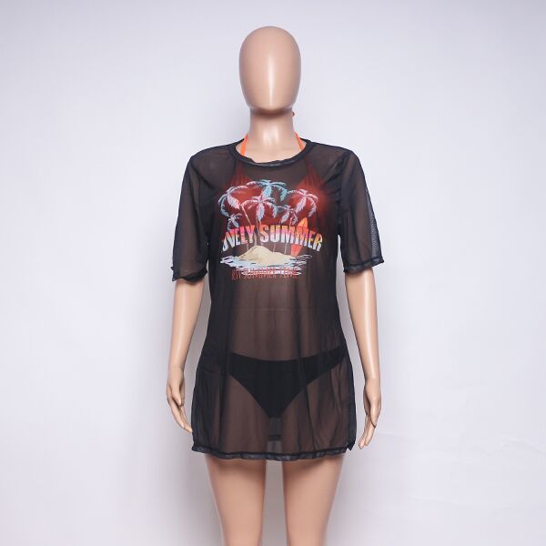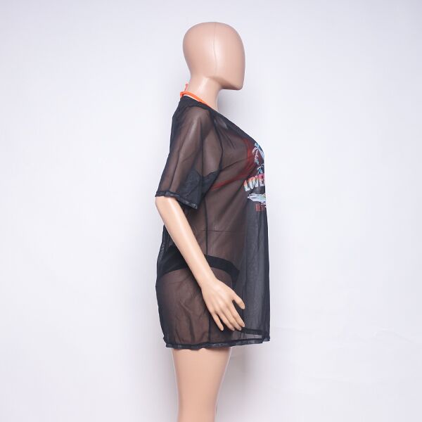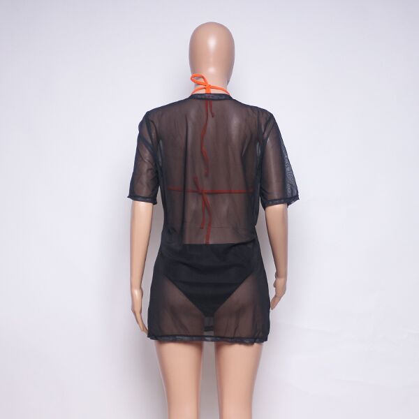 This chic three-piece bathing suit set for women features an eye-catching orange bikini top, complemented by black bottoms and a printed black mesh T-shirt. Ideal for those seeking to stand out at the beach or pool, this set combines style and flair.