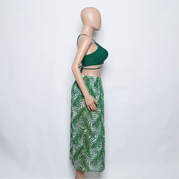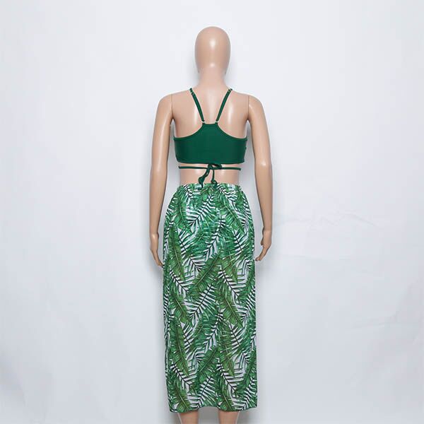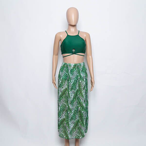 A stunning bathing suit skirt set, featuring a stylish green bikini top and bottom paired with a tropical-patterned long skirt. This ensemble exudes tropical vibes and offers both style and coverage for your beach or poolside look.