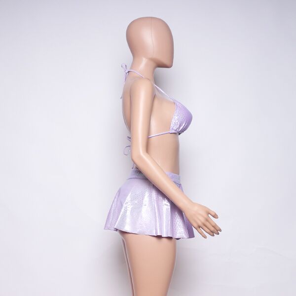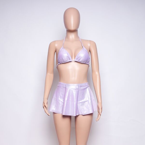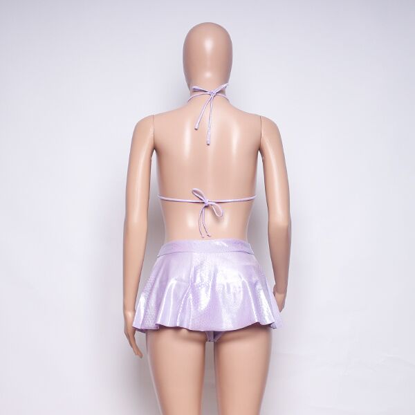 Introducing a stylish bikini set with a short skirt, all in a charming light purple color. This ensemble offers a chic and versatile option for your beach or poolside look.