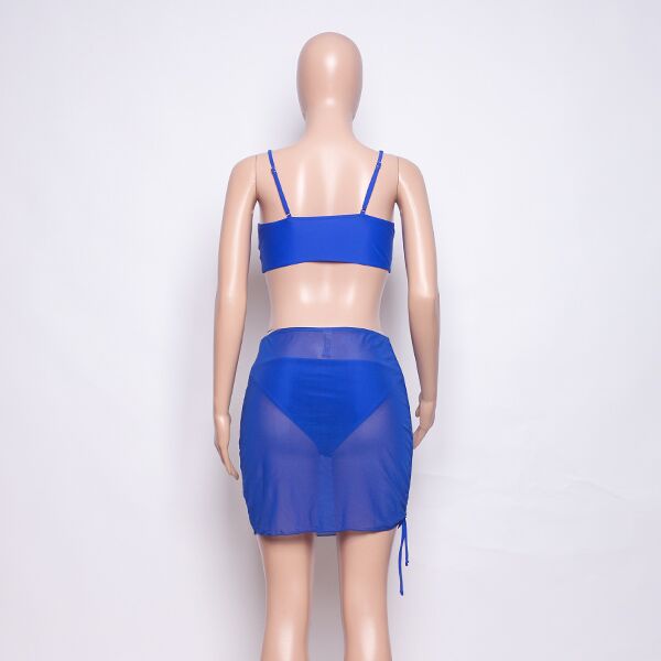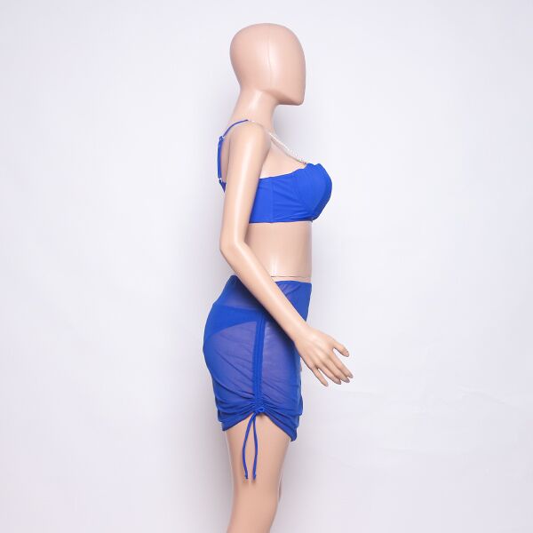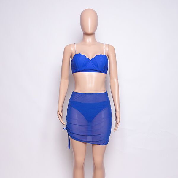 This 3-piece blue bikini set features a stunning blue mesh overlay that adds a touch of elegance and allure to the ensemble. The top boasts a push-up style adorned with pearls and scallop detailing, exuding sophistication and charm. With a scoop neck design, it offers both style and support, ensuring our customers feel confident and beautiful.