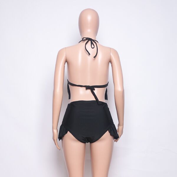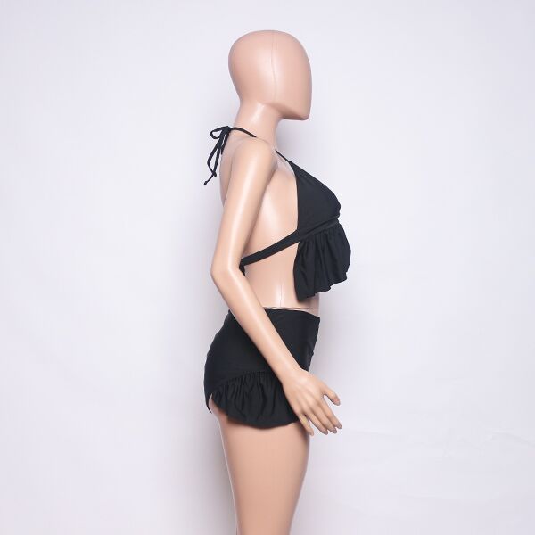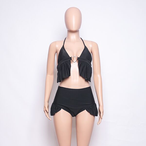 This chain bikini set is both charming and stylish. The top features a ruffle design with a heart-shaped connection, adding a romantic touch. The high-rise bottom has a ruffle hem, complementing the top beautifully. The halter neck design completes the look with elegance. This black bikini set is perfect for those who want to stand out with a touch of glamour at the beach or by the pool. Get in touch now to see more designs.