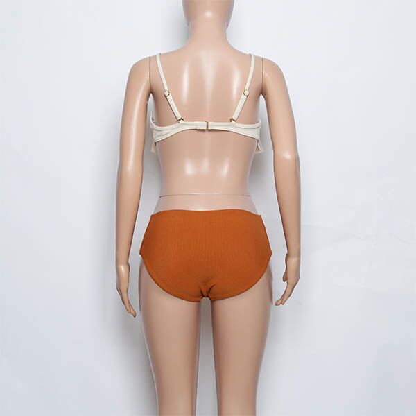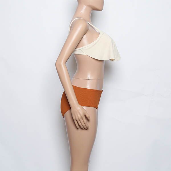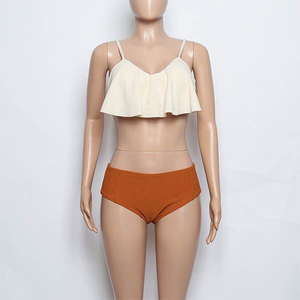 This plain bikini set features a charming ruffle bikini top, adding a playful touch to your beach look. The top is designed with a ruffle hem, adjustable drawstring, and button-back detail, offering a stylish and customizable fit. The bottom is mid-waist with full coverage, providing a comfortable and flattering silhouette. Perfect for lounging by the pool or soaking up the sun, this ruffle bikini top set combines fashion and function for a standout summer ensemble.