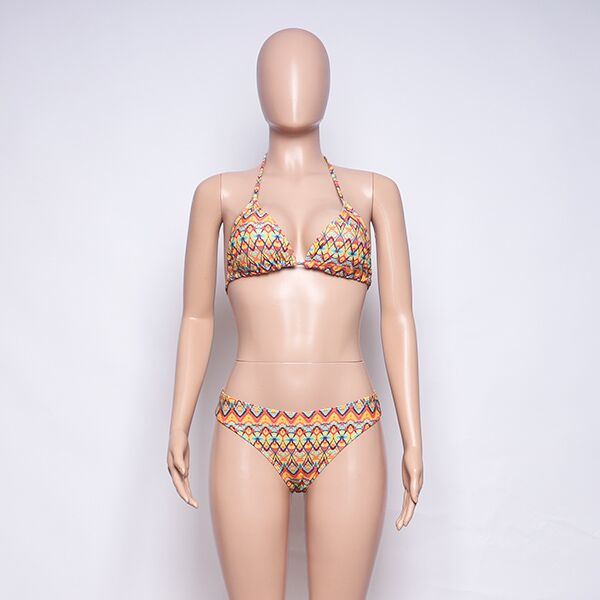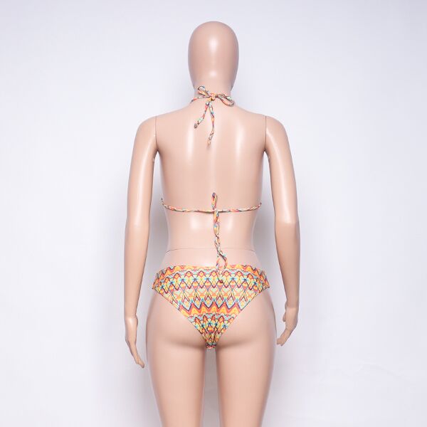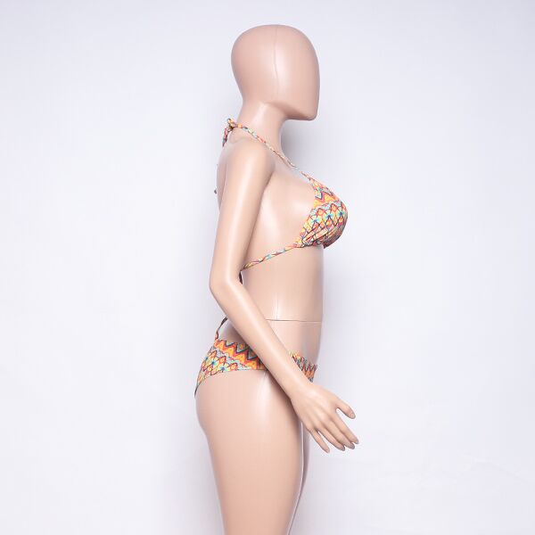 This chevron-patterned bikini set is a stylish choice for the beach or pool. The top is a classic triangle style with a tie back and halter neck, providing a customizable and flattering fit. The bottom is mid-rise with medium coverage, offering comfort and style. This triangle bikini top set is perfect for soaking up the sun or lounging by the pool, combining fashion and functionality for a standout summer look.