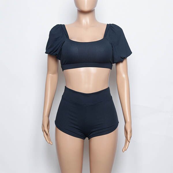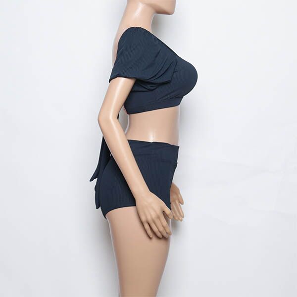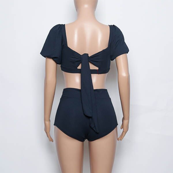 This plain bathing suit set is both stylish and comfortable, perfect for a day at the beach. The top features puff sleeves, a choker neck, and a tie-back, offering a trendy and adjustable fit. The bottom is high-leg with a boy-leg cut, providing a flattering and modest silhouette. This bathing suit set is versatile and chic, combining fashion and functionality for a standout beach look.