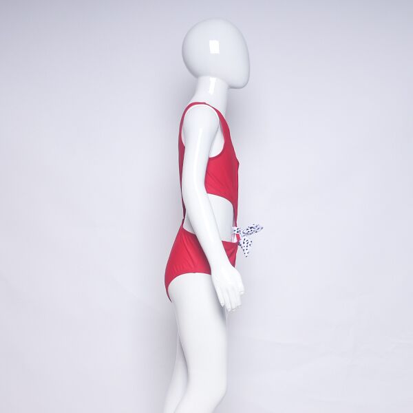 The off-shoulder top features a stylish cutout design with a cute bow detail on the front, adding a touch of flair to her look. The bottoms offer full coverage, providing both comfort and confidence as she plays and explores.