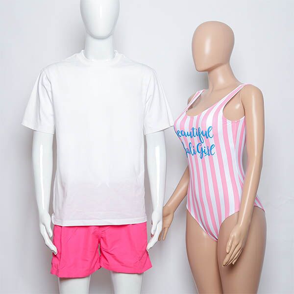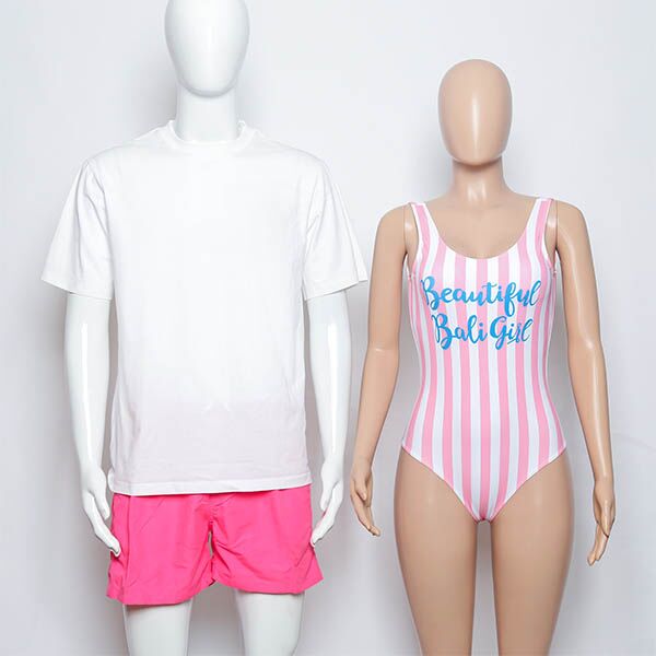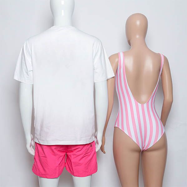 Indulge in seaside romance with our matching couple’s swimwear. Her attire boasts delicate light pink and white stripes, radiating timeless elegance. The strapless one-piece swimsuit features a flattering U-shape and alluring low-back design, ensuring both style and comfort. With full-coverage bottoms, she can confidently enjoy her time.