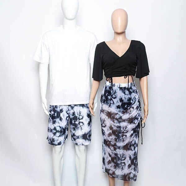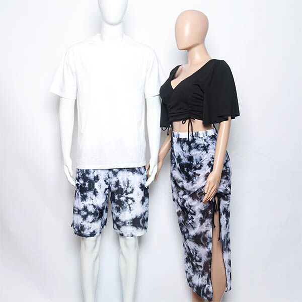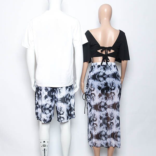 Elevate your beach style with our matching his and hers swimsuits featuring a trendy tie-dye pattern. Her two-piece bikini set in sleek black is complemented by a matching sarong adorned with the same captivating tie-dye design. The bikini top boasts an adjustable drawstring tie-back and chic short-sleeve design for added flair. Paired with the high-rise full-coverage bottom, this ensemble offers both fashion and comfort for your beach outings.