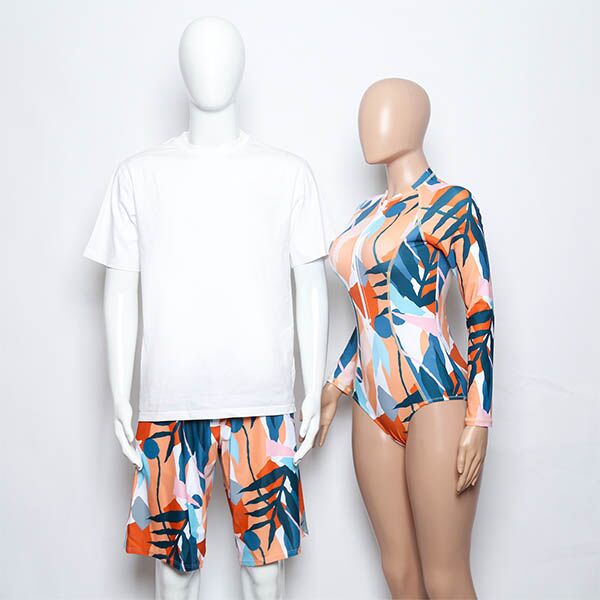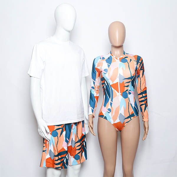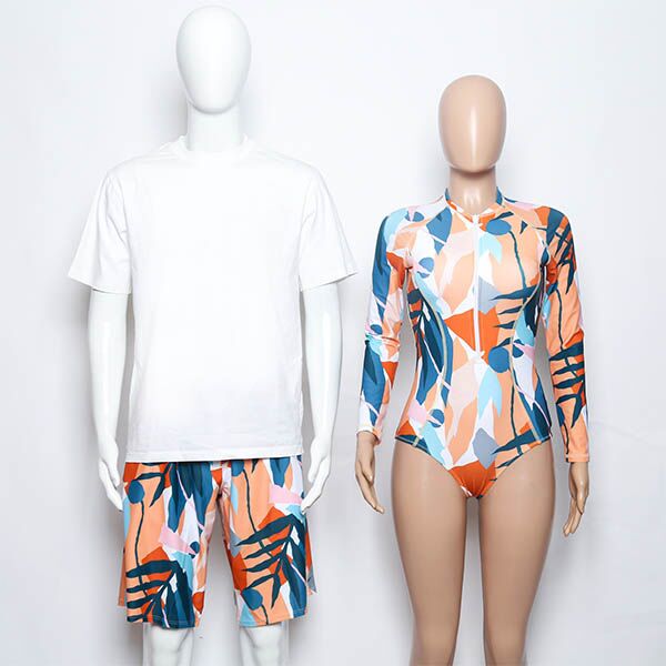 Indulge in the tropical allure with our stunning couple’s bathing suits. Her one-piece swimsuit features a vibrant tropical print. With a convenient front zipper and long sleeves, this swimsuit combines style with functionality. Enjoy full coverage and support while flaunting your beach-ready look.