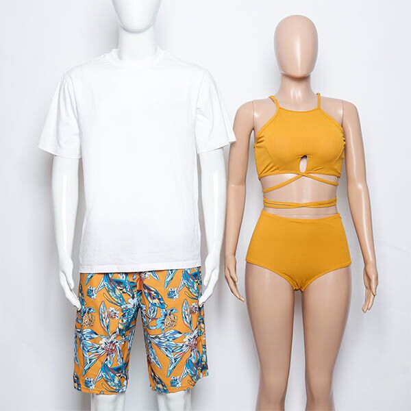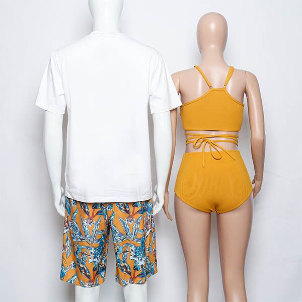 Indulge in tropical vibes with our matching his and her swimsuits. Her two-piece bikini set in vibrant orange is adorned with a captivating tropical pattern. The tank top features adjustable drawstrings and a stylish tie-back design, ensuring a comfortable and customizable fit. Paired with the high-rise full-coverage bottom, this ensemble offers both style and coverage for your beach adventures. Complete the look with the matching sarong, featuring the same tropical print on a dark orange fabric for an added touch of elegance.