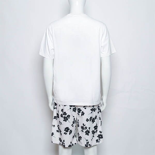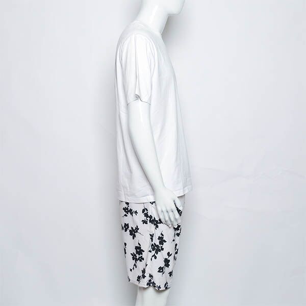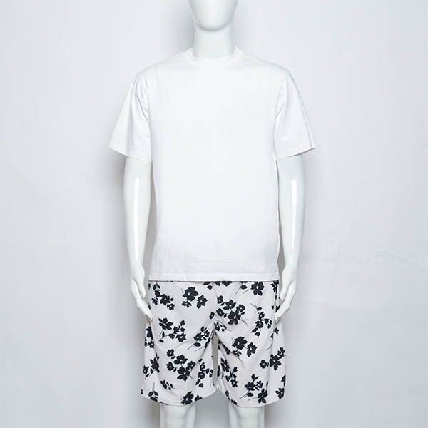 These men’s vintage swim shorts are a stylish and classic choice for the beach or pool. The shorts feature a charming floral print, with small black flowers on a white fabric background, giving them a timeless and retro look.