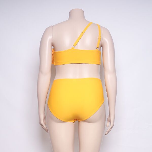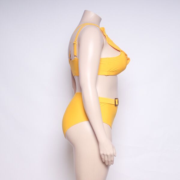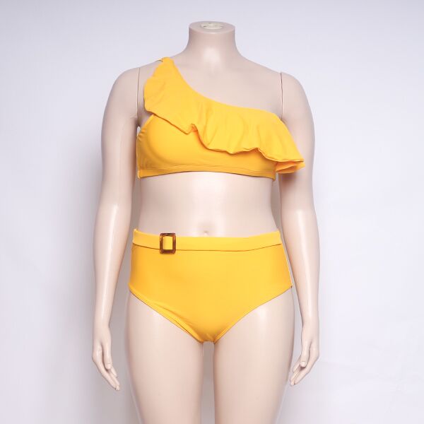 Introducing our stunning plus size high waisted bathing suits in radiant yellow, designed to embrace your curves and elevate your beachwear game. The one-shoulder top exudes elegance with its adjustable drawstring and charming ruffle hem detail, ensuring a flattering fit and a touch of femininity. Paired with high-rise bottoms featuring a belt with resin buckle, this swimsuit offers full coverage and a secure, comfortable feel.